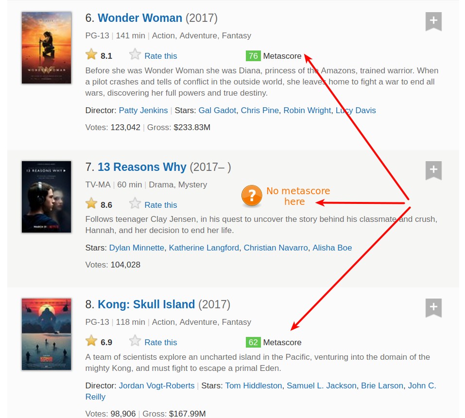 Puisque nous voulons obtenir plus de 2000 évaluations à la fois d'IMDB et de Metacritic, nous